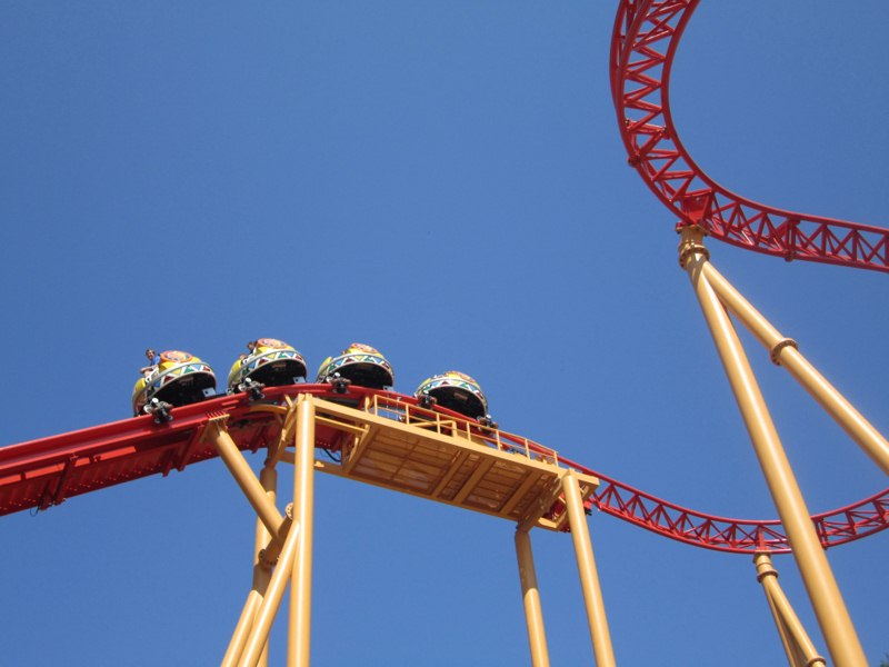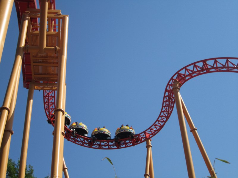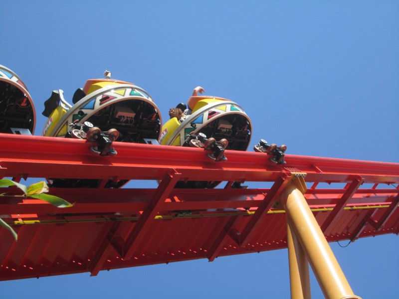 On embarque, à l'arrière, ça monte, ça commence à Spinner, on prend la first drop puis le virage au ras du sol à pleine vitesse entre les pieux, on enchaîne avec le fer à cheval, un virage ultra serré, une série de virages et de changements de directions... et c'est fini.